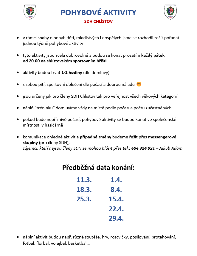 Prozatím jsme se rozhodli pro každý pátek ve večerních hodinách viz. informace vypsané níže. Termíny se mohou průběhem času dle předešlé domluvy měnit a další termíny po konci dubna opět vypíšeme ve snaze zachování tohoto režimu po celý rok. V případě špatného počasí bychom využívali společenskou místnost v naší hasičárně například k posilovaní a protahování. Jinak náplní aktivit můžou být různé společné míčové i nemíčové hry nebo jakákoli jiná pohybová aktivita.